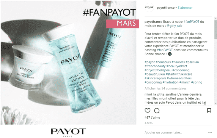 Par exemple, la marque Payot organise un concours mensuel qui récompense son « meilleur fan », à savoir l’internaute qui a posté le plus de commentaires sur le compte Instagram.