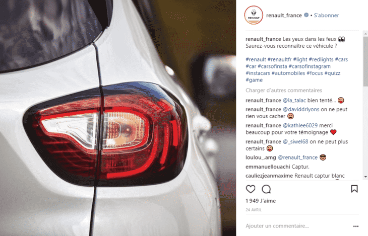 Renault propose parfois des devinettes à ses followers, pour accroître l’engagement. La marque n’hésite pas à répondre pour relancer les commentaires.