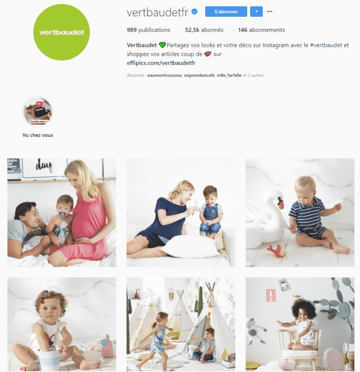 La marque Verbaudet publie uniquement des photos prises par un photographe professionnel sur son compte. Elle a pu créer un univers de marque cohérent et mettre en avant ses produits dans le quotidien de ses clients.