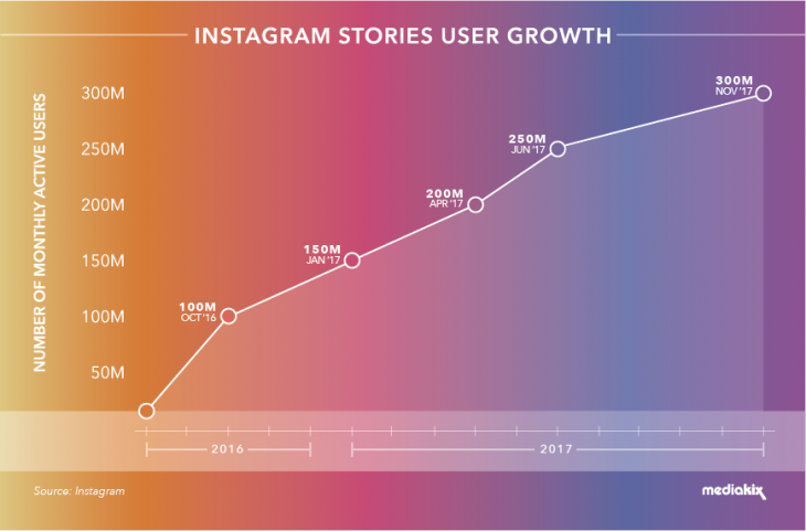 Les stories Instagram ont un véritable succès auprès des utilisateurs. Comme le démontre ce graphique de MediaKix, le nombre d’internautes qui regardent quotidiennement ces publications éphémères ne cesse de croître :
