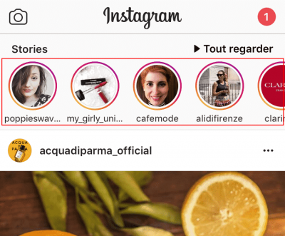 De plus, les stories profitent d’une meilleure visibilité que les publications classiques. Pour commencer, elles s’affichent en haut de la page d’accueil :
