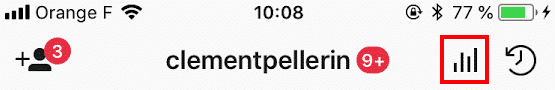 Une des fonctionnalités que tous les Community Managers doivent utiliser est le module de statistiques offert par le réseau social. Pour y accéder, rendez-vous sur la page de votre profil puis cliquez sur l’histogramme situé en haut à droite de l’écran :