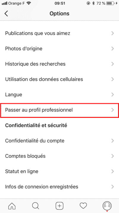 Cliquez sur celle-ci et dans la liste, cliquez sur « Passer au profil professionnel » :