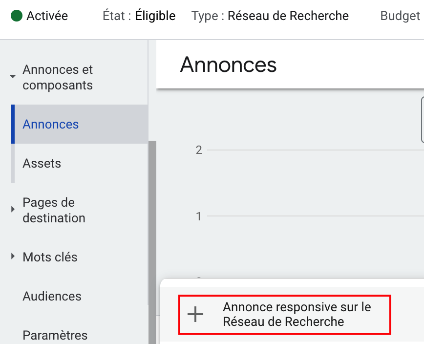 Ensuite, cliquez sur le bouton « + » sur fond bleu puis choisissez « Annonce responsive sur le Réseau de Recherche » :