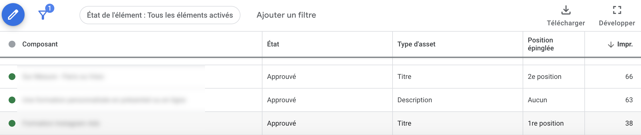 Il vous sera ensuite proposé un tableau avec les performances de chacun de vos éléments d’annonces, avec le nombre d’impressions de ceux-ci.