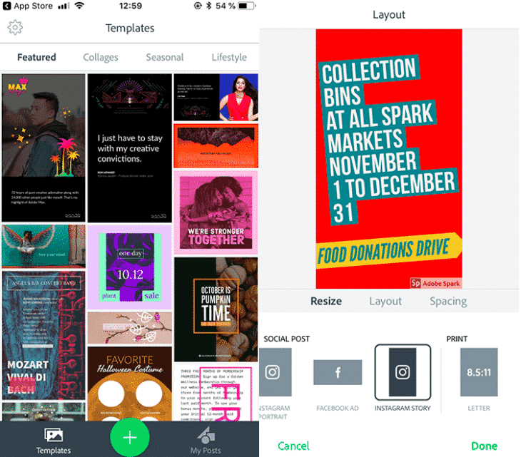 Bien qu’Adobe soit particulièrement connu pour ses logiciels d’édition de photos/vidéos sophistiqués, l’application Spark Post rend facile la création de visuels rapides sans aucune connaissance technique.