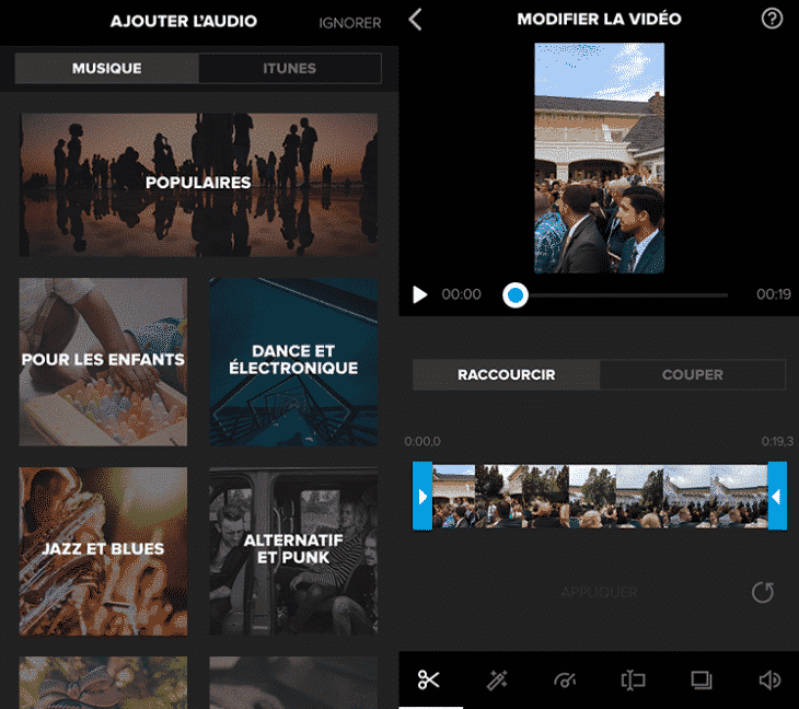 Vous pouvez également utiliser Splice pour ajouter de la musique sur vos vidéos, en sélectionnant des propositions depuis l’app ou depuis votre iTunes. Une fois que vous avez téléchargé l’application, envoyez une vidéo depuis votre pellicule ou enregistrez en une nouvelle pour commencer.