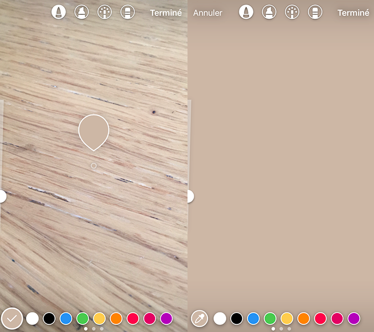 Cliquez sur l’icône « Crayon » située en haut à droite de l’écran de production de votre Story, puis sur l’icône « Pipette » en bas à gauche de l’écran pour sélectionner la couleur de votre choix.