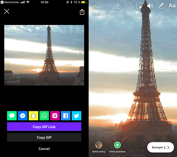 En effet, il est très simple d’exporter un Gif depuis l’app pour l’envoyer sur l’écran de production d’une story.