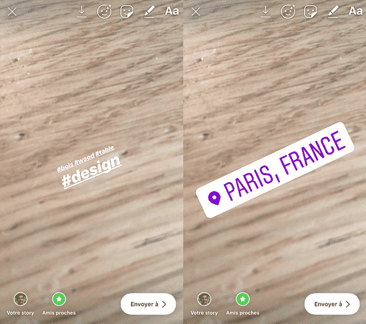 Si vous souhaitez masquer les hashtags de vos Stories Instagram, tapez vos hashtags avec l’outil de texte (vous pouvez en insérer jusqu’à 10) et ensuite pincez les pour les rendre plus petits.