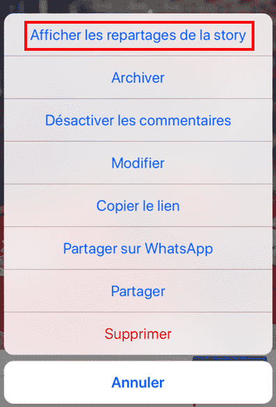 Pour accéder à cette information, il vous sera nécessaire de cliquer sur les 3 petits points en haut à droite de la publication, puis cliquer sur « Afficher les repartages de la story » :