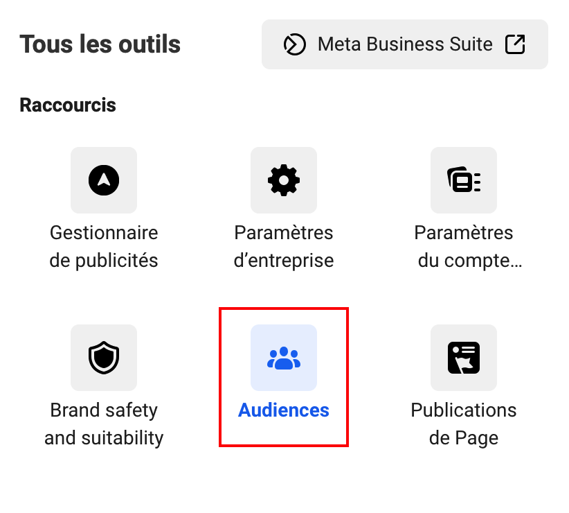 Rendez-vous dans votre Business Manager Facebook et cliquez sur « Audiences » dans la liste de vos outils.