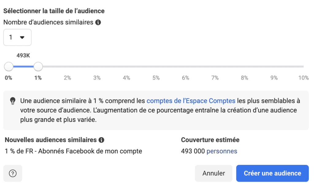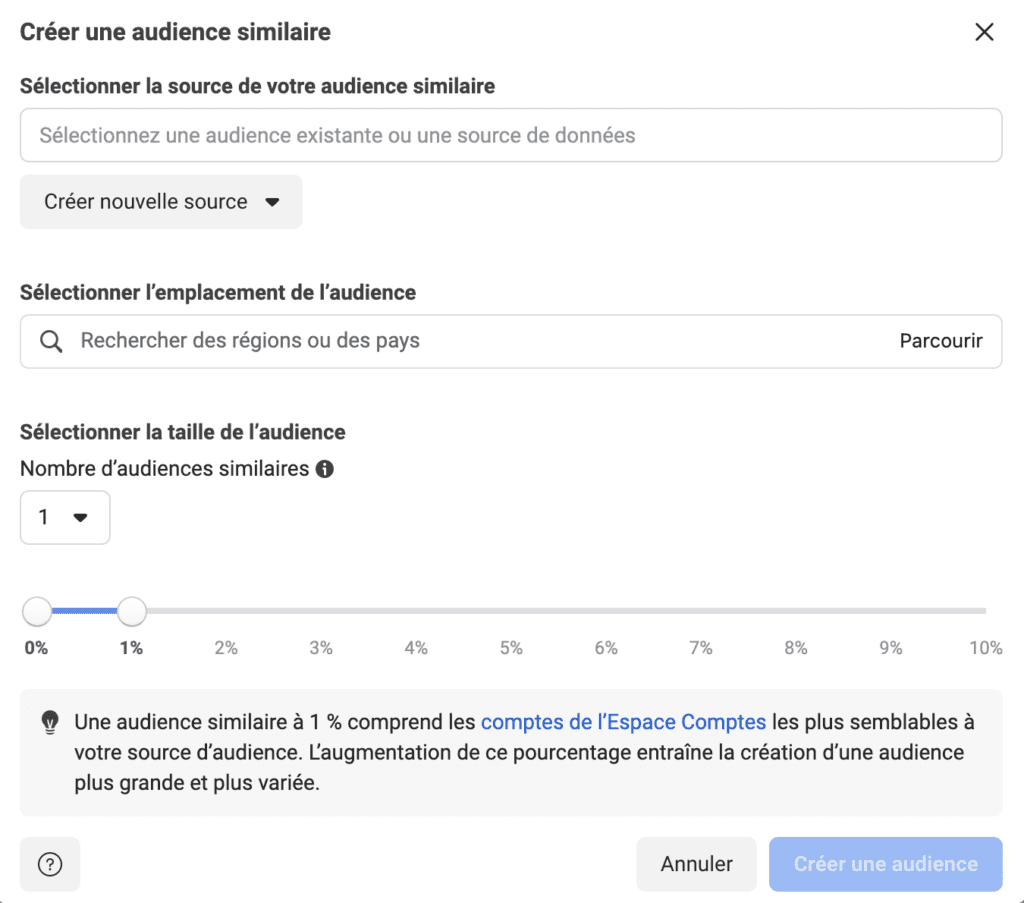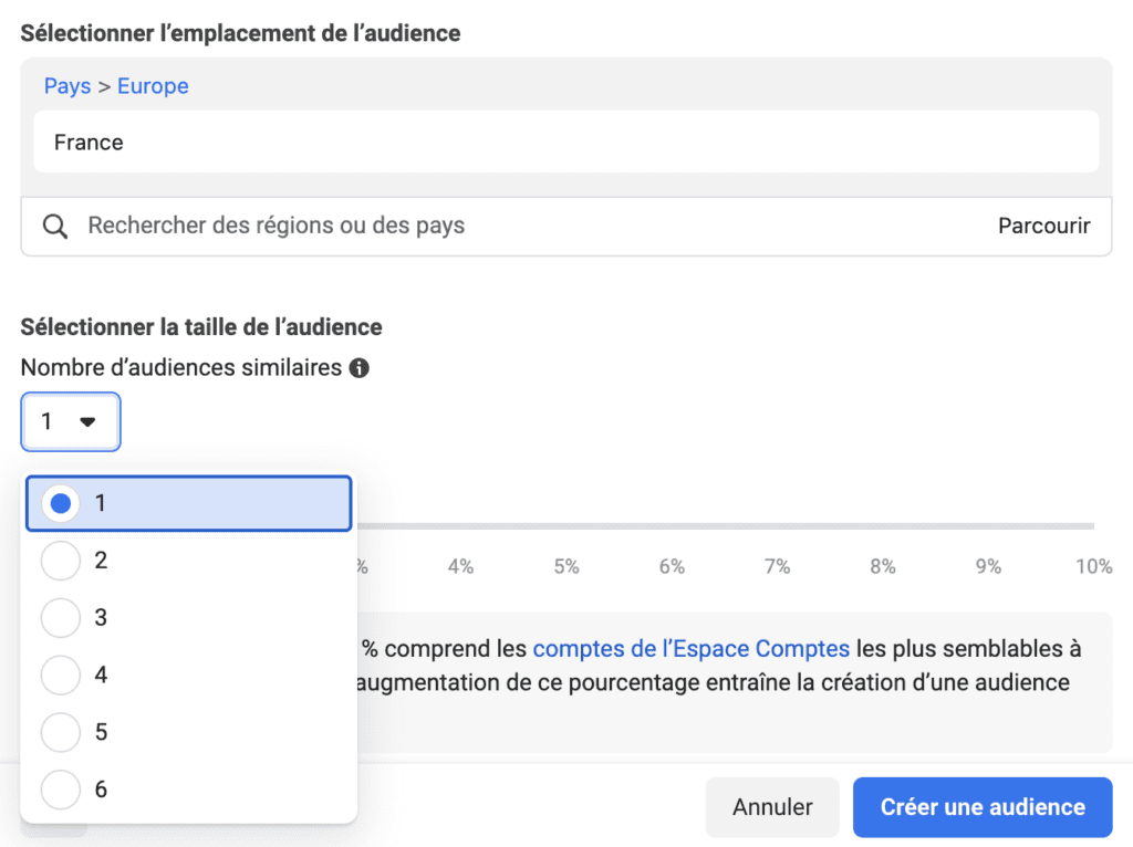 Vous pouvez contrôler la taille et la similarité de votre audience similaire en définissant un pourcentage de 1 à 10 pour cibler ou élargir votre audience en fonction du pays ou de la région d’où proviennent ces personnes.