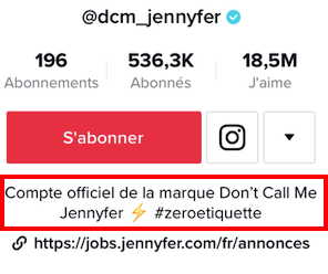 Il peut s’agir d’une présentation sobre de votre compte TikTok, comme le propose Jennyfer ci-dessous :
