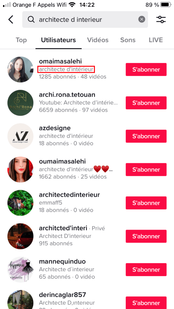 Si vous y insérez des mots-clés stratégiques, vous pourriez alors vous faire découvrir par de potentiels clients, comme c’est le cas ci-dessous lors de ma recherche d’utilisateur pour le mot-clé « Architecte d’intérieur » :