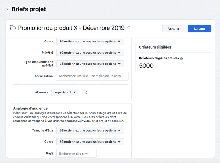 Le nombre de créateurs correspondant à vos critères sera affiché en haut à droite de votre écran, ce qui vous donnera une bonne visibilité sur la portée potentielle de votre brief.