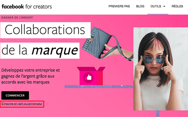 Si vous souhaitez bénéficier des options de recherche d’influenceurs proposées par Facebook, il vous faudra vous rendre dans un premier temps sur cette page web puis cliquer sur « S’inscrire en tant qu’annonceur ».