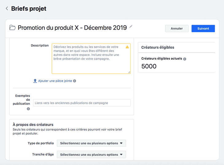 Le nombre de créateurs correspondant à vos critères sera affiché en haut à droite de votre écran, ce qui vous donnera une bonne visibilité sur la portée potentielle de votre brief.