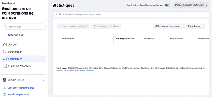 Une rubrique du Brand Collabs Manager Facebook sera dédiée à regrouper l’ensemble des publications de marque postées sur les profils des influenceurs avec des données telles que :