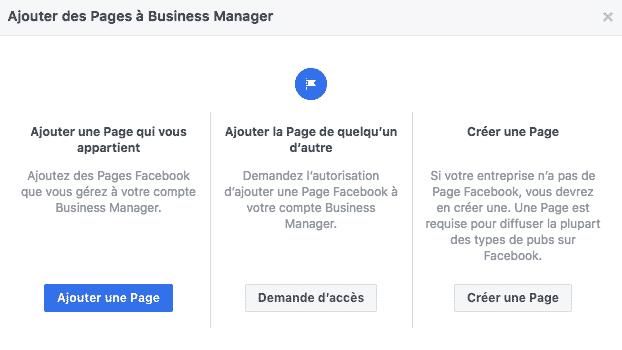 Lors de cette étape, vous aurez de multiples choix. Vous pourrez ajouter une page Facebook existante ou en créer une nouvelle. Si vous gérez de multiples pages pour des clients, vous pourrez également demander l’accès à celles-ci.