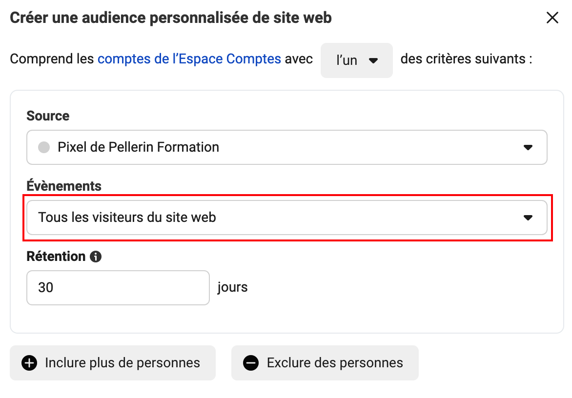 Ensuite, ajoutez une exclusion. Cliquez sur « Exclure » et ensuite dans le menu déroulant, sélectionnez l’évènement de conversion que vous auriez installé sur votre page de remerciement. Par exemple, si vous avez installé un évènement « Prospects », sélectionnez « Prospects » dans la liste.