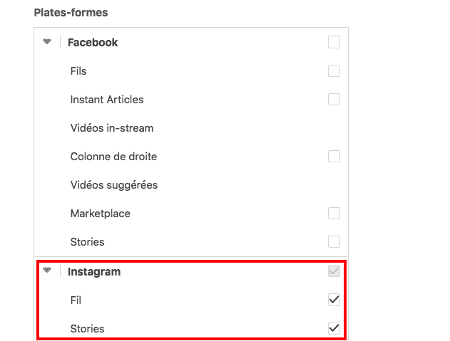 Une fois que votre audience correspondant aux visiteurs du site Internet est créée, il vous suffit de l’ajouter au niveau de la ligne « Audiences personnalisées » présentée lors de l’écran de définition des critères de ciblage, puis de choisir le placement publicitaire adéquat, en l’occurrence Instagram dans le cadre de cet article.