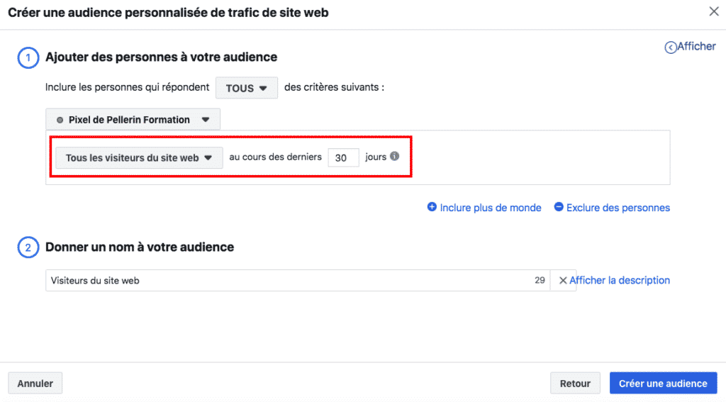 Il s’agit de la première étape à mettre en place au plus tôt si vous comptez recibler les visiteurs de votre site Internet. En effet, il faudra de la matière à ré-utiliser pour vos campagnes publicitaires, et donc, en fonction du trafic de votre site Internet, cela prendra plus où moins de temps pour récolter suffisamment de données nécessaires au lancement d’une publicité : plusieurs heures, jours ou semaines selon les cas.