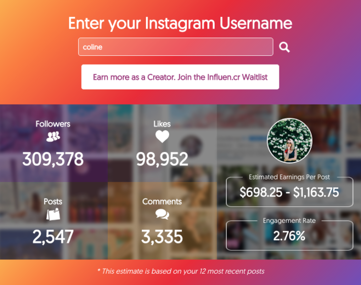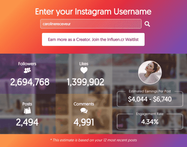 Dans le cas où vous ne savez absolument pas comment chiffrer le prix potentiel d’une publication sur Instagram, un outil gratuit en ligne pourra vous aider. Celui-ci se nomme « Instagram Money Calculator » et est extrêmement simple d’utilisation. Il vous faudra rentrer le nom du compte en question et laisser travailler l’outil.
