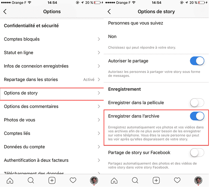 Avant de l’envoyer dans votre Story du moment, veillez à ce que les « Archives » de votre application soient bien activées :