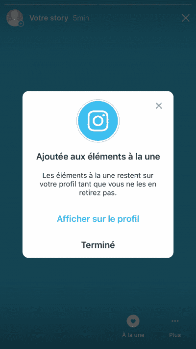 Instagram vous demandera si vous souhaitez faire afficher cette Highlight Story sur votre profil dès à présent ou si vous souhaitez la publier plus tard. Pour un affichage instantané, cliquez sur « Afficher sur le profil » :