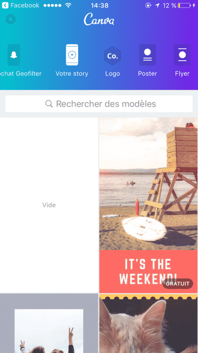 Dans le cadre de cet article, je vous conseillerai d’utiliser l’application mobile de Canva. Dès que celle-ci est lancée, vous devriez avoir la possibilité de pouvoir créer votre premier modèle de Story, tel que nous le voyons ci-dessous :