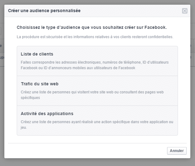 Sur Facebook, la fonctionnalité « Audiences » vous donne la possibilité de toucher les personnes présentes dans votre base de données, comme les inscrits à votre newsletter par exemple.
