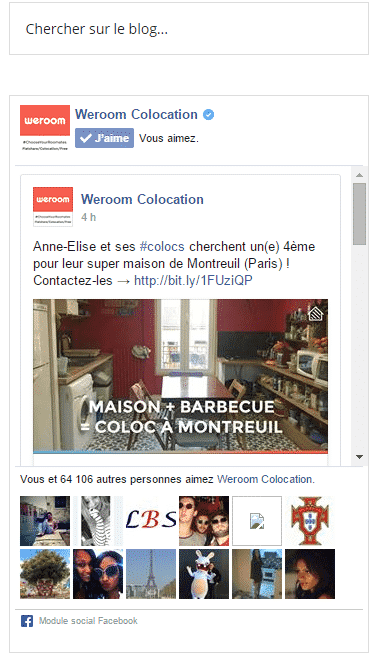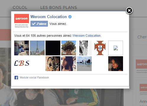 Exemple : le site de recherche de co-location Weroom met peu ses réseaux sociaux en avant sur son site internet, sur lequel les boutons se situent en bas de site, tandis qu’une fanbox est bien visible en colonne de droite sur son blog, renforcée par une fenêtre pop-up proposant de devenir fan.