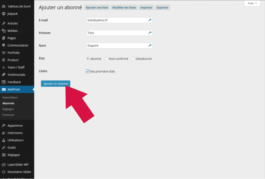 - Allez sur “Mailpoet”, puis sur “Abonnés” puis sur “Ajouter une liste”.