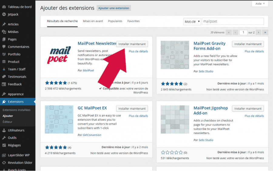 - en vous rendant sur le back office de votre site : rendez vous sur “extensions”, “ajouter”, puis dans “chercher parmi les extensions” écrivez “Mailpoet”, puis cliquez sur “installer maintenant”, et enfin sur “activer”.