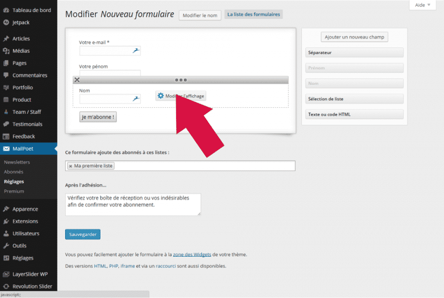 - Créez ensuite un formulaire qui servira aux abonnements et aux désabonnements. Vous pourrez ensuite l’intégrer où bon vous semble sur votre site, l’idéal étant de l’utiliser en tant que widget (apparence / widgets, puis glissez-le dans la barre souhaitée).