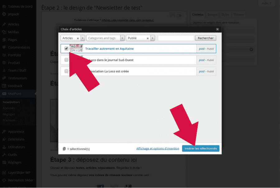 - Pour ajouter du contenu, glissez la boite “Article WordPress” dans la zone souhaitée, sélectionnez les articles à intégrer, puis valider en cliquant sur “Insérer les sélectionnés”.