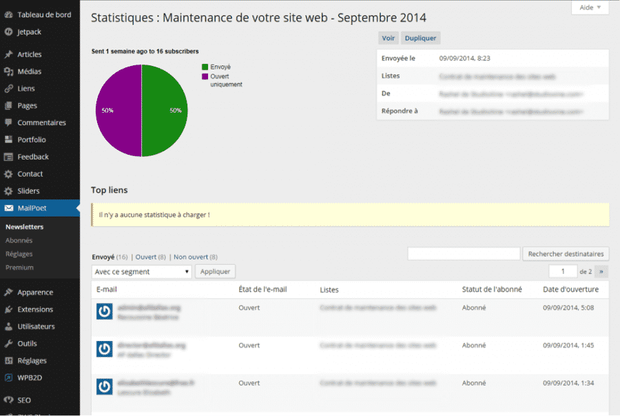 La version gratuite de Mailpoet vous propose des statistiques légères (voir image) mais suffisantes pour commencer.