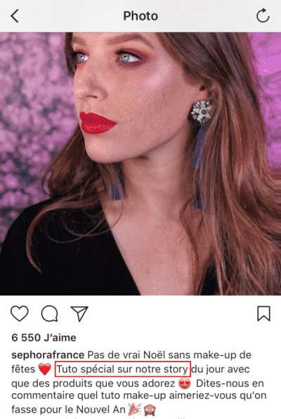 Par exemple, Sephora France publie une photo d’une mannequin bien maquillée sur son profil. La marque invite alors ses abonnés à consulter sa story dans laquelle elle propose un tutoriel pour réaliser le même maquillage chez soi :