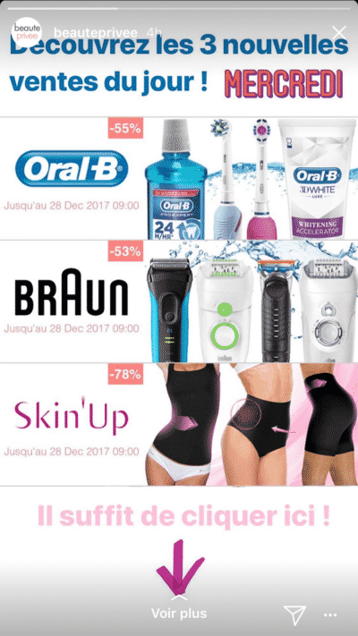 Cependant, pour promouvoir ses ventes privées de manière plus directe et générer du trafic sur son site, la marque utilise les stories. Le visuel est moins travaillé, mais il donne une information concrète et incite aux clics.