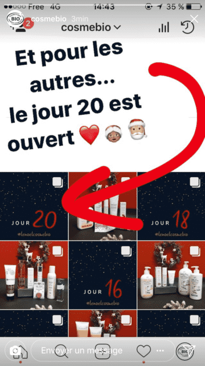 À l’inverse, le label Cosmebio se sert des stories pour promouvoir le concours qui se déroule sur son flux d’actualités :