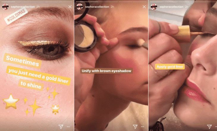 La publication de Stories successives permet aussi de diffuser des vidéos plus longues que sur le fil d’actualités. Par conséquent, vous pouvez vous en servir pour créer des tutoriels complets, comme le fait Sephora Collection ci-dessous :