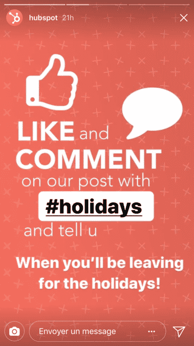 - dans vos Stories, récompensez vos fidèles followers, en y organisant un concours, par exemple. C’est le choix qu’a fait Hubspot :