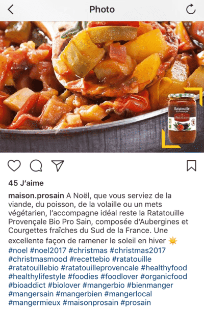 Dans votre flux d’actualités, pensez davantage au recrutement en utilisant des hashtags. Par exemple, dans ses publications, la marque Pro Sain ajoute toujours des mots-clés en rapport avec son univers :