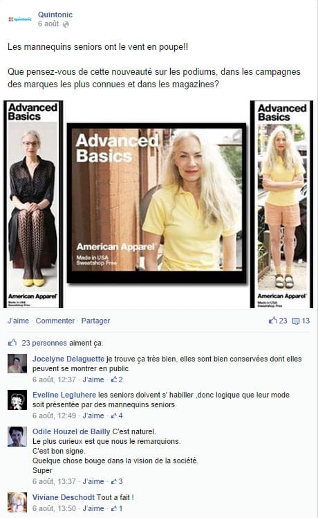 Si Damart ne mise pas tout sur les séniors et cherche à toucher les “mères et leurs mères” sur Facebook, la marque semble avoir intégré la transition générationnelle et s’adapter peu à peu à leur présence grandissante sur les réseaux sociaux.