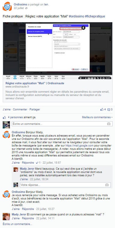 Ordissimo utilise Facebook pour aider ses clients avec de nombreux conseils pratiques pour progresser dans son utilisation des nouvelles technologies. Les publications renvoient vers les articles du site ordissinaute.fr :