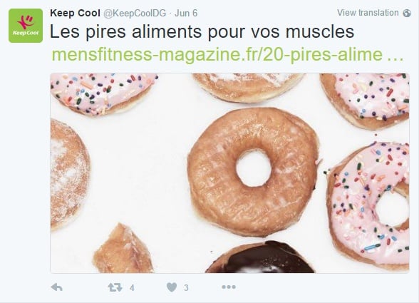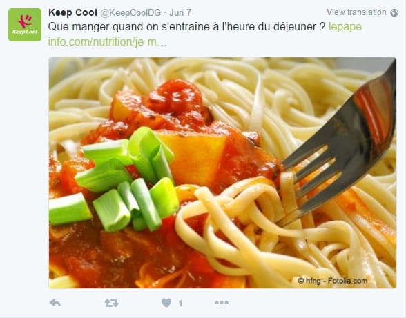 Sur Twitter, le centre Keepcool effectue une veille sur les articles qui conseillent des régimes ou aliments spécifiques pour les sportifs. Il partage quotidiennement des astuces pour améliorer son alimentation, faire le plein d’énergie, tout en accélérant la perte de poids :
