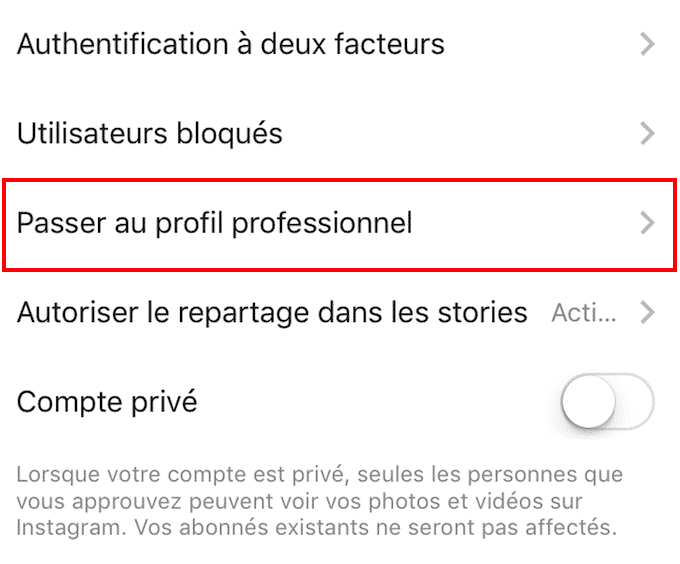 Pré-requis : il vous faudra convertir votre compte personnel en compte professionnel si cela n’est pas déjà fait en vous rendant dans les paramètres de votre application :