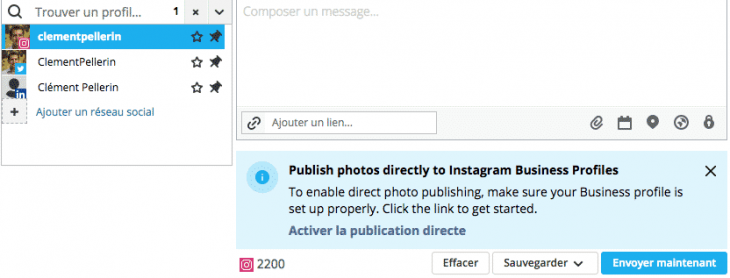 Après avoir créé votre compte gratuit sur la plateforme, vous devez avoir accès à l’espace de publication sur lequel vous pourrez retrouver votre ou vos compte(s) Instagram synchronisé(s) :