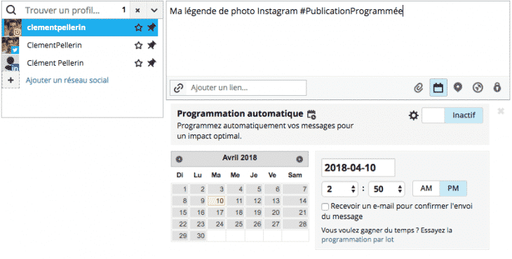 Il vous suffira ensuite d’envoyer votre image sur l’outil et rédiger votre légende, puis cliquer sur l’icône « Calendrier » située à droite du trombone :